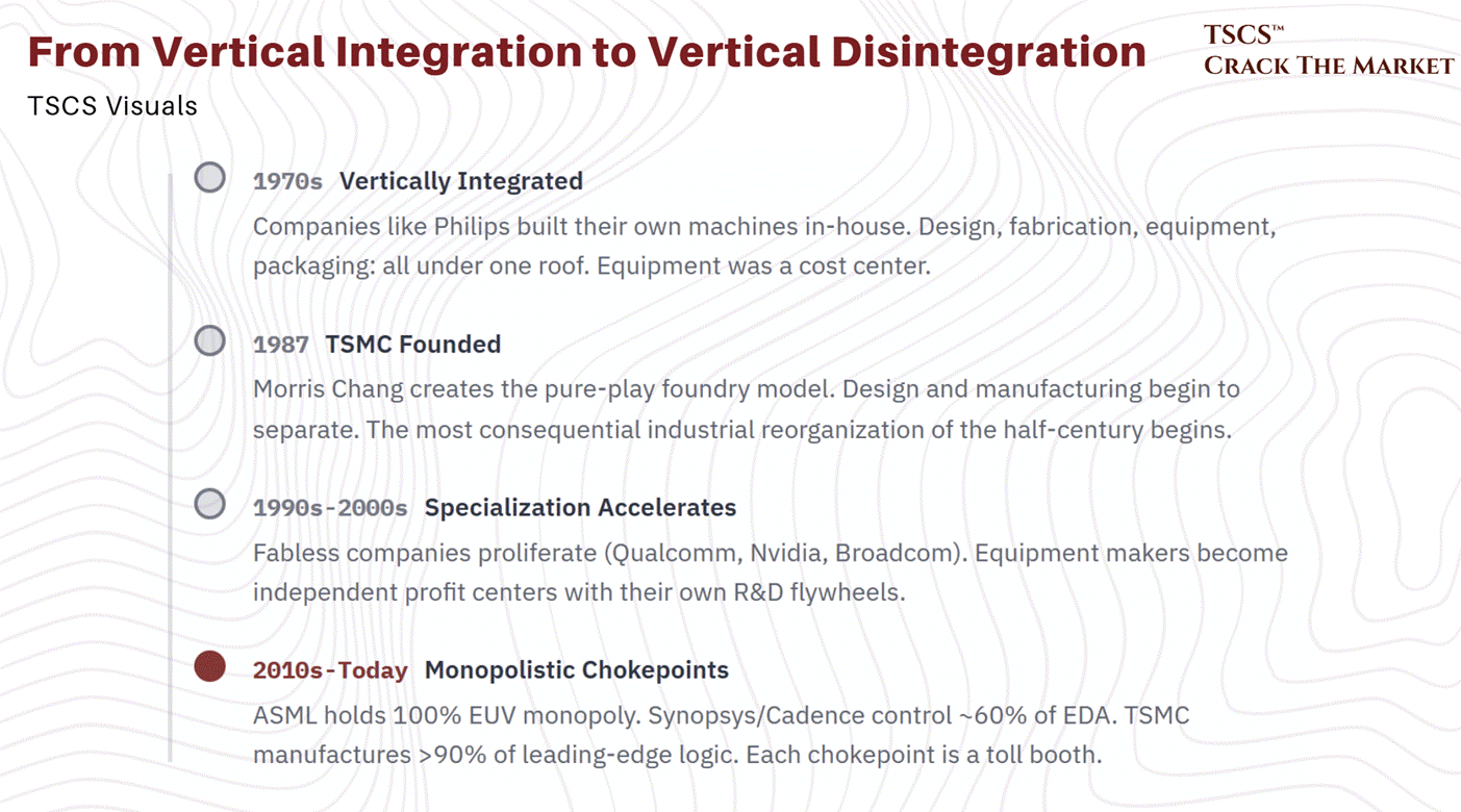 The semiconductor industry did not always look like this. In the 1970s, companies like Philips built their own machines in-house. Design, fabrication, equipment, packaging: all under one roof. That vertical integration is dead. What replaced it is one of the most elegant and ruthless supply chains in industrial history, a chain where every link is a chokepoint and every chokepoint is a toll booth.