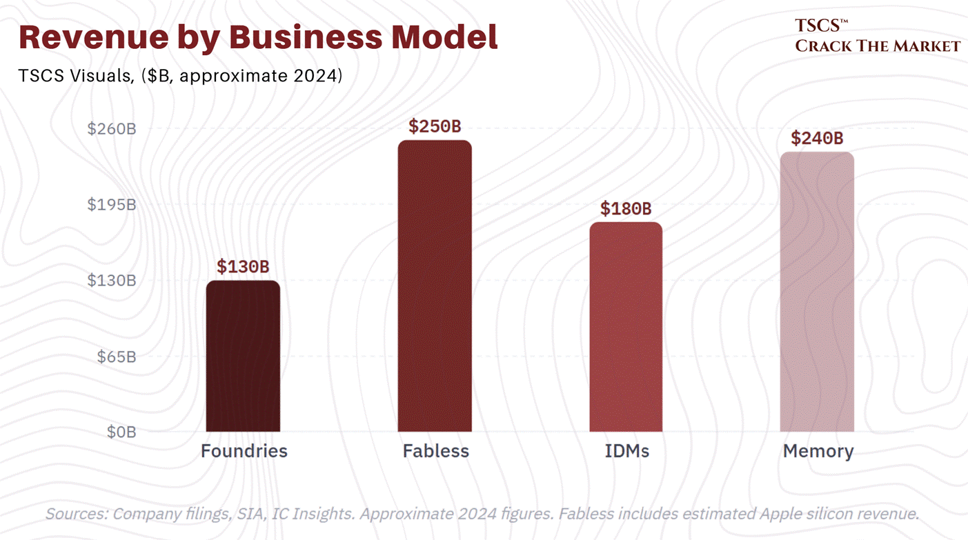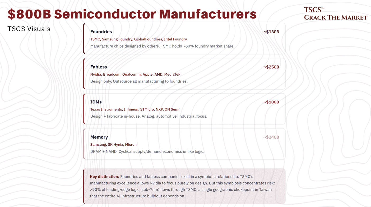 Below them sit the semiconductor manufacturers ($800 billion market), which break into three distinct business models. Foundries (TSMC, GlobalFoundries, Samsung’s foundry division, and Intel Foundry) specialize in manufacturing chips designed by other companies. Fabless companies (Nvidia, Broadcom, Qualcomm, Apple) do the designing. Integrated Device Manufacturers, or IDMs (Texas Instruments, Infineon, STMicroelectronics), handle everything from design through fabrication and testing in-house, typically focused on analog and mature-node chips for automotive and industrial applications. Memory sits in its own category (Samsung, SK Hynix, Micron), with economics driven by supply/demand cycles that look nothing like logic.