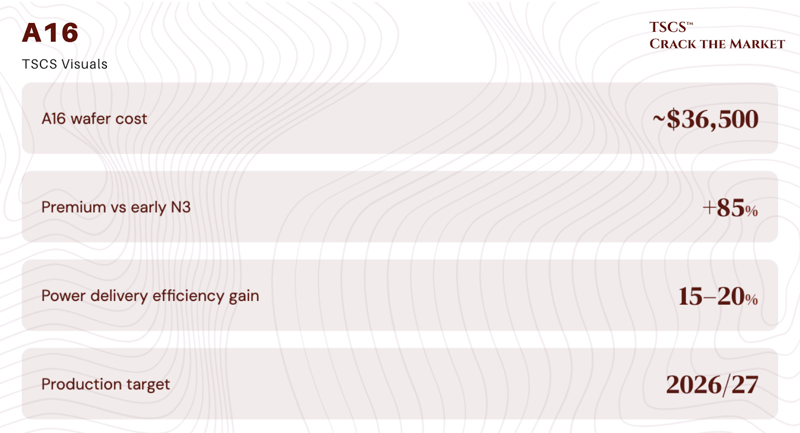 The engineering is extreme. Wafers must be thinned to near invisibility and aligned with atomic precision on both sides. A single A16 wafer is estimated to cost roughly $36,500, an 85% premium over early N3. Customers will pay it without hesitation. For a hyperscaler spending billions annually on electricity, a 15 to 20% improvement in power delivery efficiency pays back the wafer premium thousands of times over across a fleet of millions of chips.