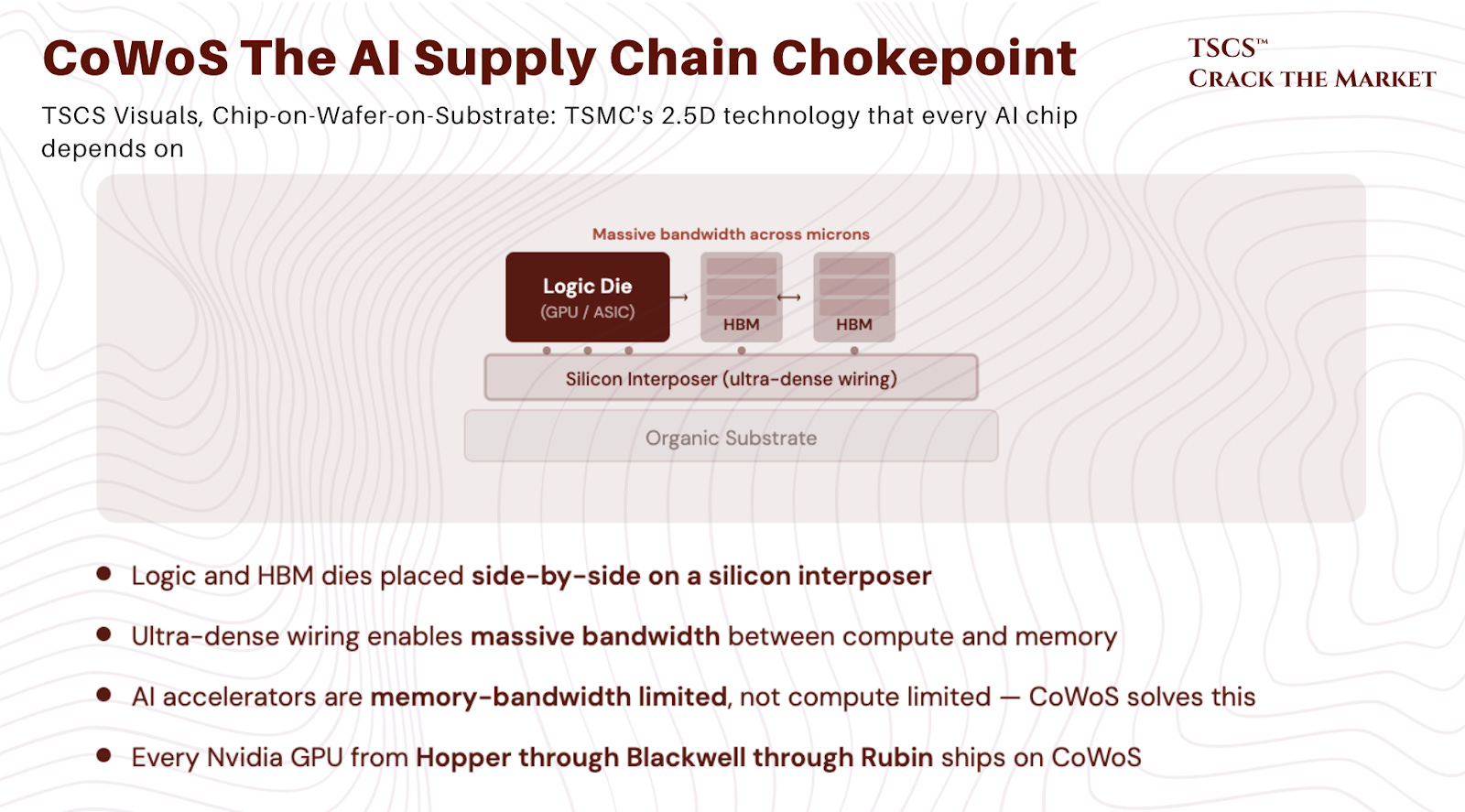 CoWoS (Chip-on-Wafer-on-Substrate) is TSMC’s 2.5D packaging technology, and it is the chokepoint of the global AI supply chain. Multiple logic and memory dies are placed side by side on a silicon interposer, connected by ultra-dense wiring that enables massive bandwidth between compute and memory. Instead of chips shouting at each other across a circuit board, they whisper across microns of silicon.