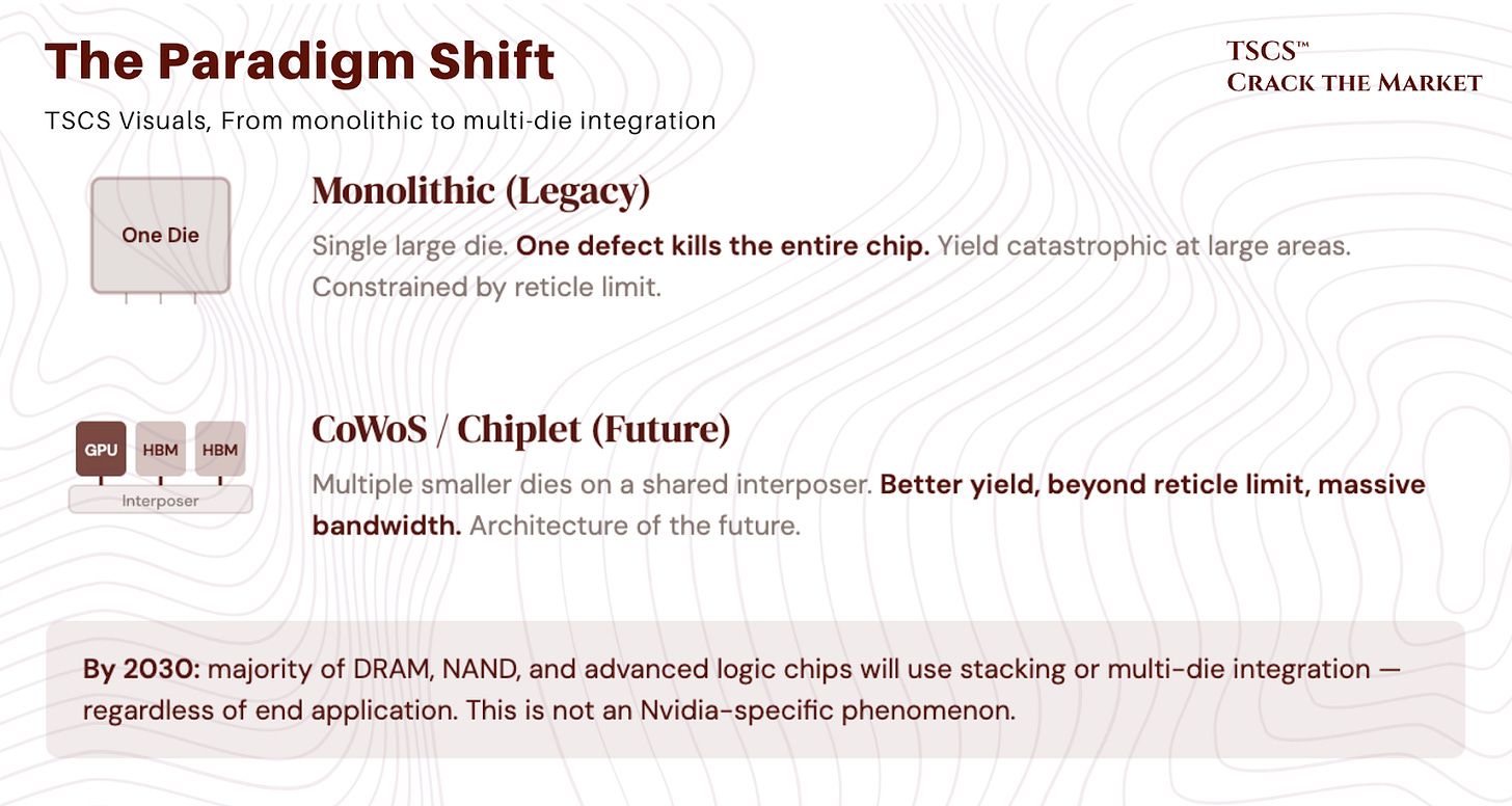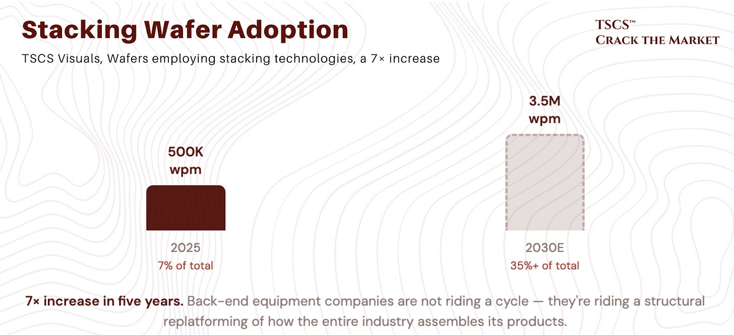 TSCS view: The chiplet transition is the single most underappreciated structural shift in semiconductors today, and most investors are still framing it as an Nvidia-specific phenomenon. It is not. By 2030, the majority of DRAM, NAND, and advanced logic chips (including smartphone processors) will use some form of stacking or multi-die integration regardless of the end application. The number of wafers employing stacking technologies is projected to rise from 500,000 wpm (7% of total consumption) in 2025 to 3.5 million wpm (over 35%) by 2030. That is a 7x increase in five years. The back-end equipment companies serving this transition (Besi for bonding, Disco for grinding, Advantest for testing) are not riding a cycle. They are riding a structural replatforming of how the entire industry assembles its products.