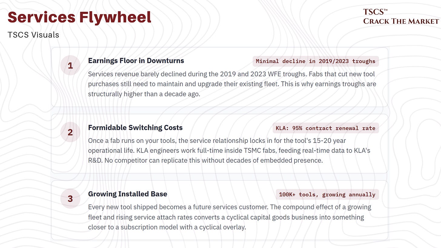 Our view: We discussed KLA’s moat extensively in the China section of this piece. The short version: if you want semicap exposure with the lowest China risk, the highest margins, and the most structural growth tailwind (complexity-driven inspection intensity), KLA is your answer. It trades at a premium for a reason, and the premium is justified. The only knock is that it is a slower grower than the more cyclical names, which means it underperforms in the early innings of a sharp upcycle. In a risk-adjusted, full-cycle framework, KLA is arguably the best business in the entire WFE chain.