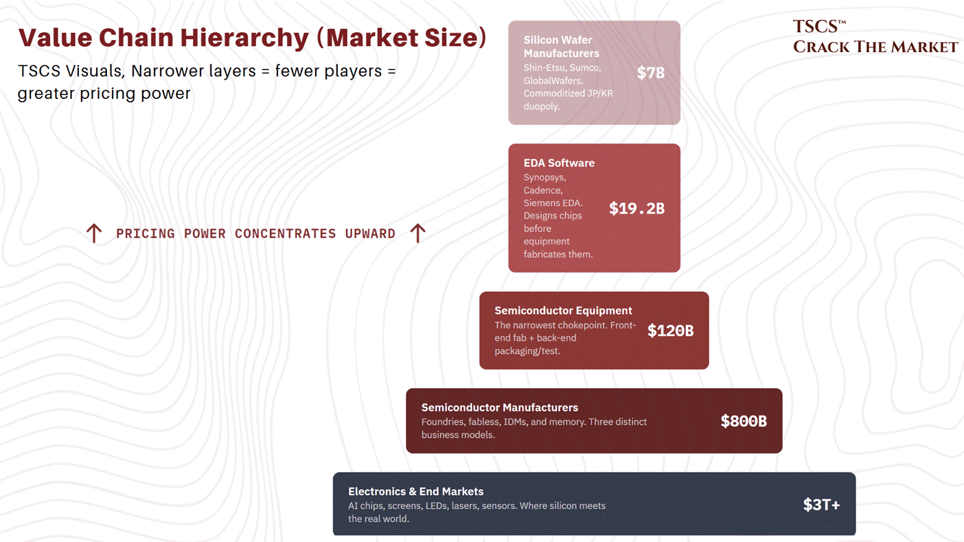 The chain begins with silicon wafer manufacturers ($7 billion market), companies like Shin-Etsu, Sumco, and GlobalWafers that slice ultra-pure semiconductor material into the substrates on which everything else is built. This is a Japanese and South Korean duopoly, largely commoditized, and not where the interesting economics live.