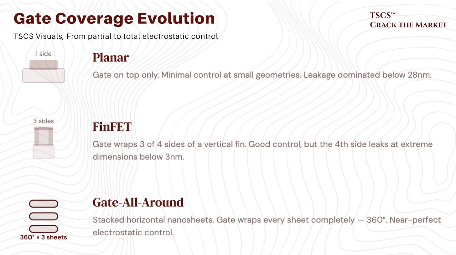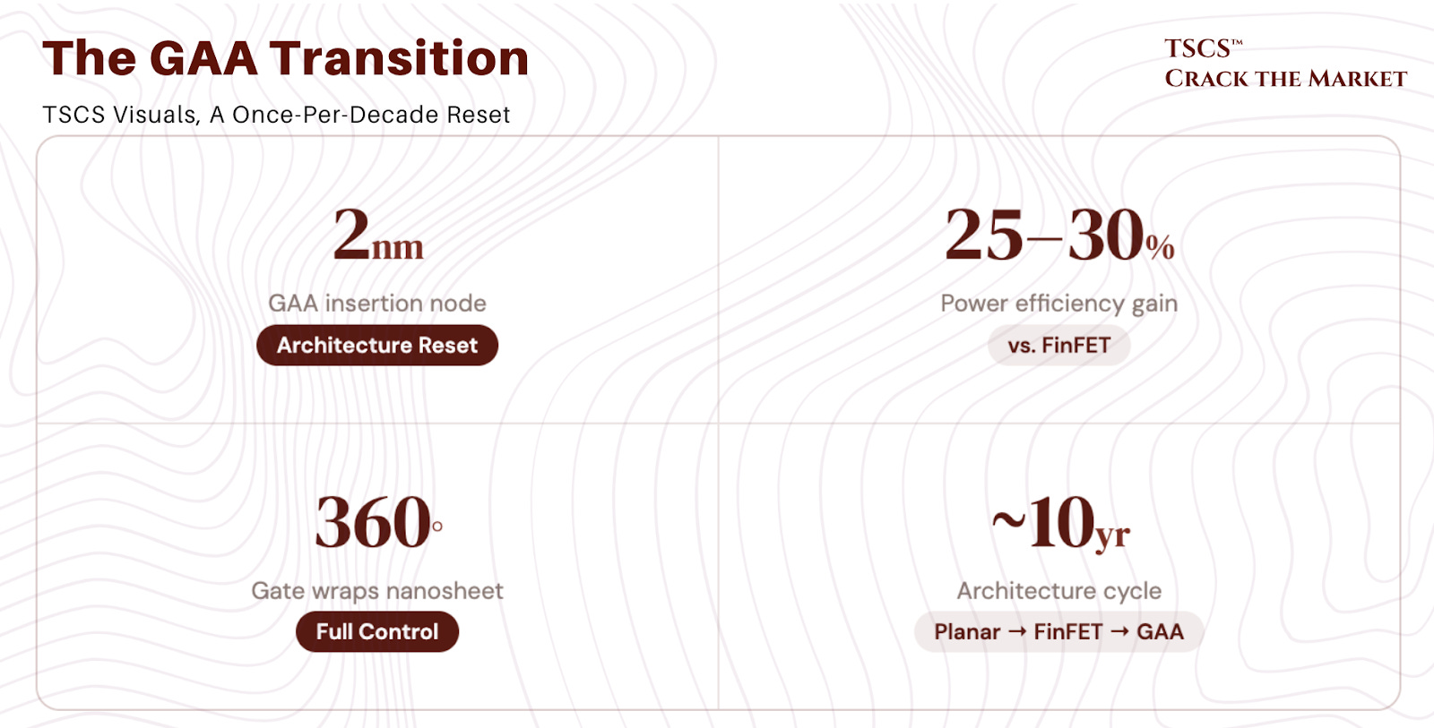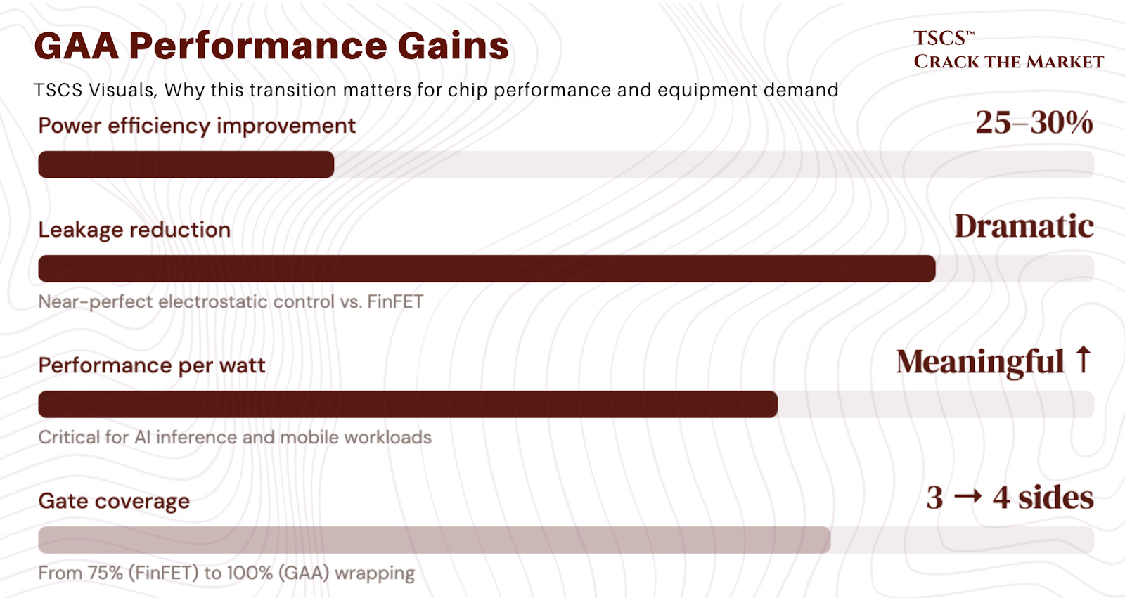 Gate-All-Around replaces the vertical fin with stacked horizontal nanosheets of silicon. The gate wraps completely around each sheet, 360 degrees. Near-perfect electrostatic control. Leakage drops dramatically. Power efficiency improves 25 to 30%. Performance per watt jumps meaningfully. This is not an incremental node shrink. It is a fundamental architectural reset, the kind that happens once per decade and reprices the entire equipment chain.