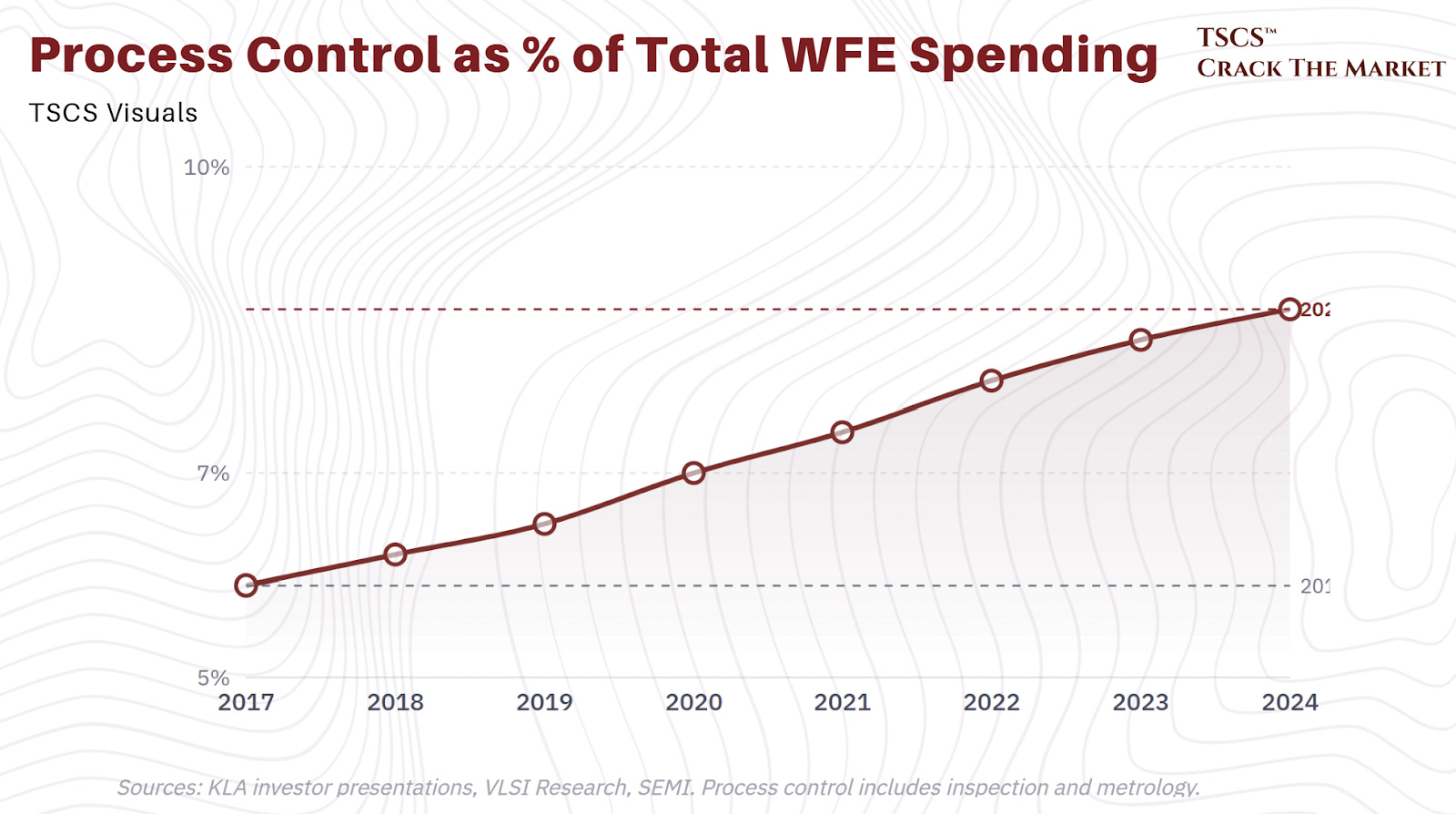 Process control (inspection and metrology) verifies that everything above was done correctly. KLA owns this with over 50% market share. As chips get more complex, the probability of defects per layer rises, and the cost of a defective wafer rises with it. Process control intensity has increased from 5.9% to 8.6% of total WFE over the past seven years. This is not cyclical. It is structural.
