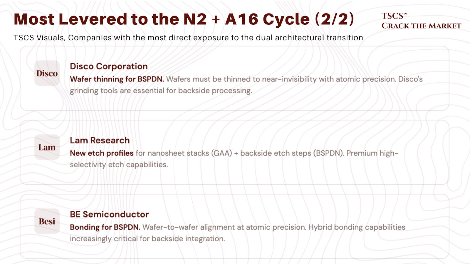 Our view: Backside power delivery is the innovation that most generalist investors have not yet internalized, and it has profound implications for the equipment chain. BSPDN requires processing both sides of the wafer, which effectively doubles the number of equipment steps for the power delivery layers. Wafer thinning and backside alignment require entirely new tool sets (grinding from Disco, bonding from Besi, new deposition and etch steps from AMAT and Lam). This is not theoretical future demand. TSMC’s A16 is on the roadmap for 2026/2027 production, and equipment orders for the pilot lines are already flowing. If GAA at N2 is the tool reuse cliff, BSPDN at A16 is the tool count expansion. Together, they represent a one-two punch of equipment intensity escalation that the 9% WFE CAGR consensus may be underestimating. The semicap companies most levered to this dynamic are ASMi (ALD for GAA), Disco (wafer thinning for BSPDN), AMAT (materials engineering for both), and KLA (inspection complexity doubles when you process both sides of a wafer).