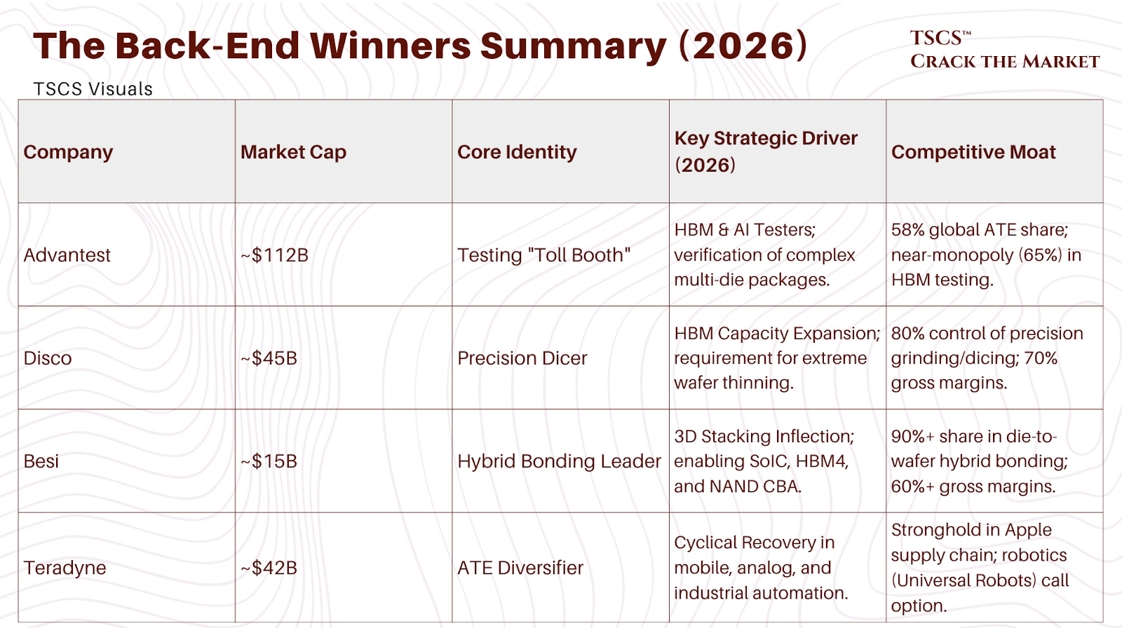 TSCS view: The stacking trajectory from 7% to 35%+ of total wafer consumption by 2030 is the kind of structural shift that creates multi-year compounding opportunities in the companies supplying the enabling equipment. Three names stand out to us. Besi has over 90% share in die-to-wafer hybrid bonding, the exact technology required for SoIC, HBM4, and NAND CBA. Disco controls 80% of precision grinding and dicing, a step that becomes more critical and more frequent as wafers are thinned for 3D stacking. Advantest holds 58% of the ATE market overall and 65% of HBM testing specifically, and testing intensity per chip is rising exponentially as multi-die packages require verification at every integration step, not just final test. These are not speculative plays on a future technology. The volume ramp is happening now, the capacity expansions are funded, and the order books are filling. The risk is not adoption. The risk is that valuations already reflect the growth, which at 30 to 45x forward earnings for some of these names, is a legitimate concern. More on this in the investor playbook.