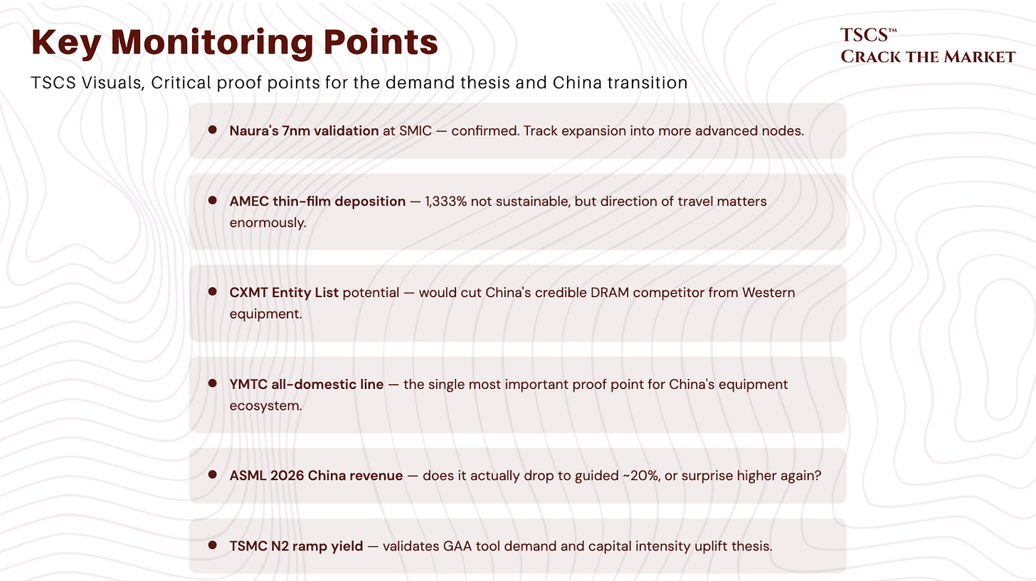 The key things to monitor: Naura’s technology validation at 7nm (confirmed at SMIC), AMEC’s thin-film deposition scaling (1,333% growth is not sustainable but direction matters enormously), CXMT’s potential Entity List addition, YMTC’s all-domestic production line (the single most important proof point for China’s equipment ecosystem), and whether ASML’s 2026 China revenue actually drops to the guided 20% or surprises higher again.