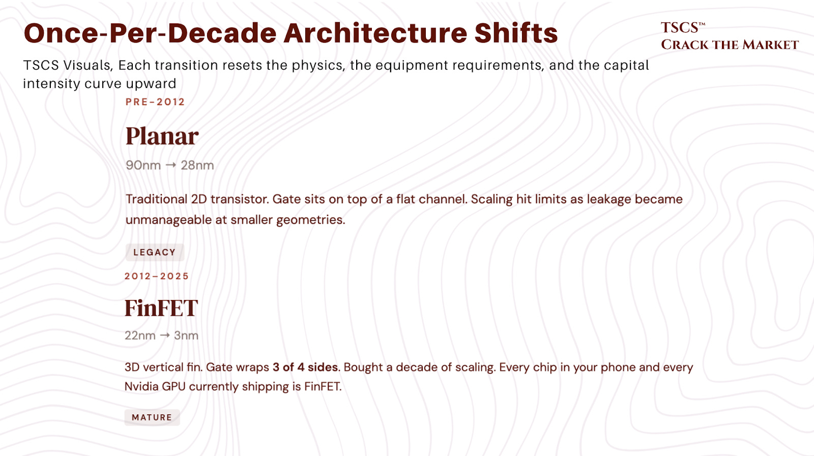 The semiconductor industry changes the architecture of its fundamental building block roughly once per decade. Planar transistors gave way to FinFET in 2012. FinFET is now giving way to Gate-All-Around. Each transition resets the physics, resets the equipment requirements, and resets the capital intensity curve upward. We are in the middle of one of those resets right now.