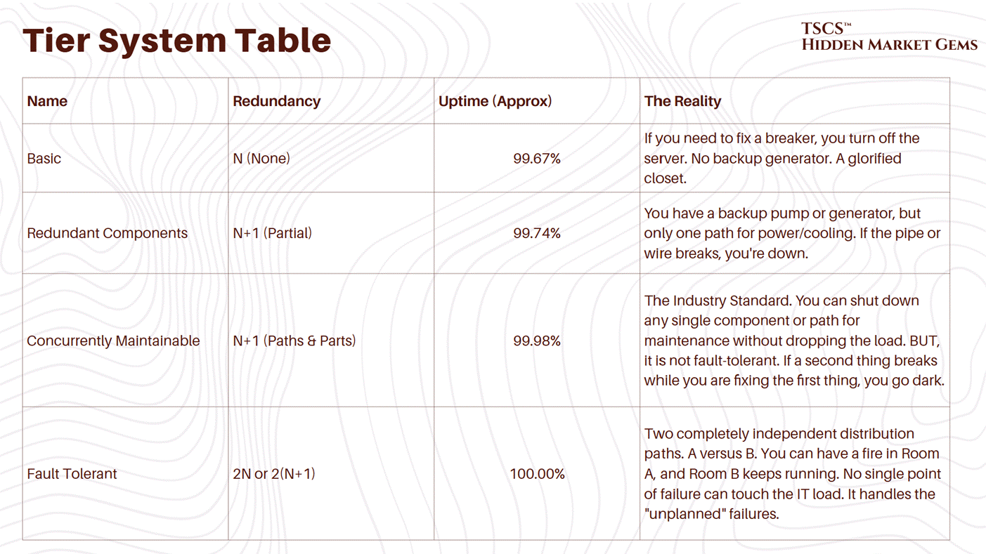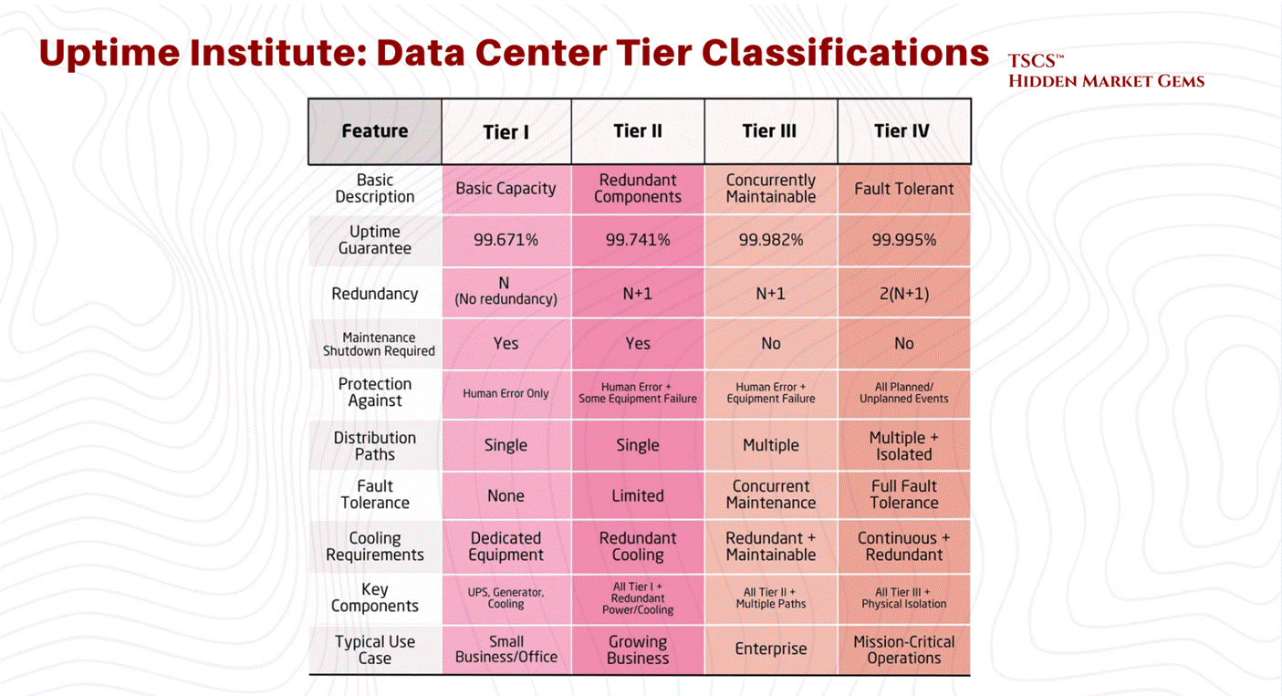 The Uptime Institute defines Tiers (I, II, III, IV) based on this redundancy.