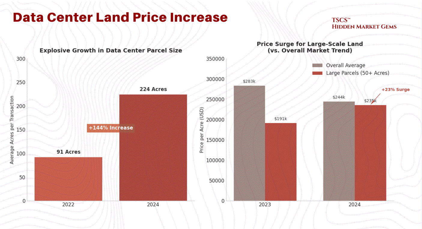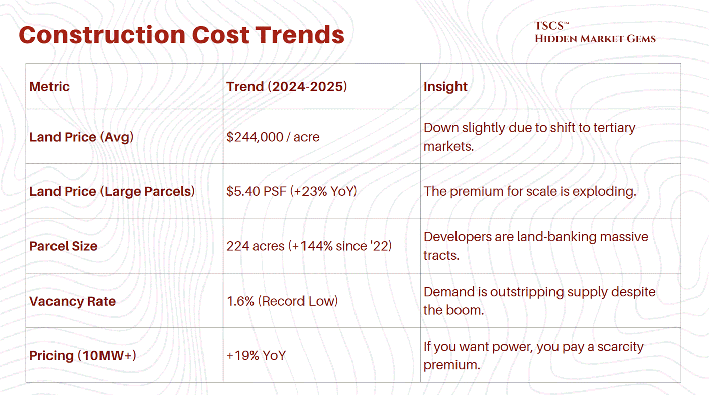 Why the premium for size? Because the hyperscalers want to build “multi-building campuses.” They want to lock in the land now so they can expand later without negotiating with a new landlord. The average parcel size for a transaction has ballooned to 224 acres in 2024, a 144% increase since 2022. They are buying up entire zip codes.