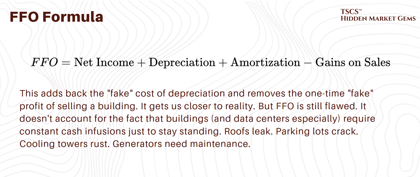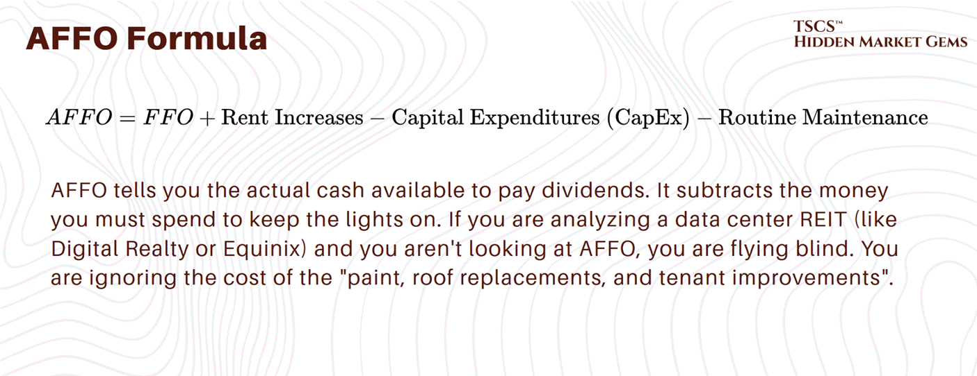 Thanks again for doing this. The scope is much appreciated. I have one expansion based on my recent years as a REIT analyst (but not one who focused on Data Center REITs). AFFO has no formal definition. Many REITs subtract "maintenance capex" but not "growth capex," and the distinction between the two is nuanced. So some REITs report an AFFO that is significantly larger than what I would view as their Funds Available for Distribution. I discuss this most recently here: https://focusedinvesting.substack.com/p/judging-reit-articles