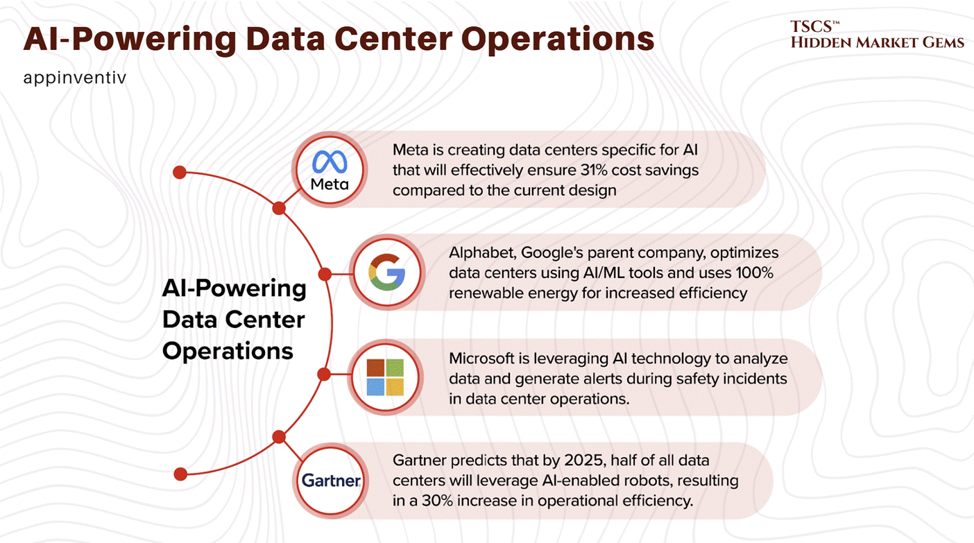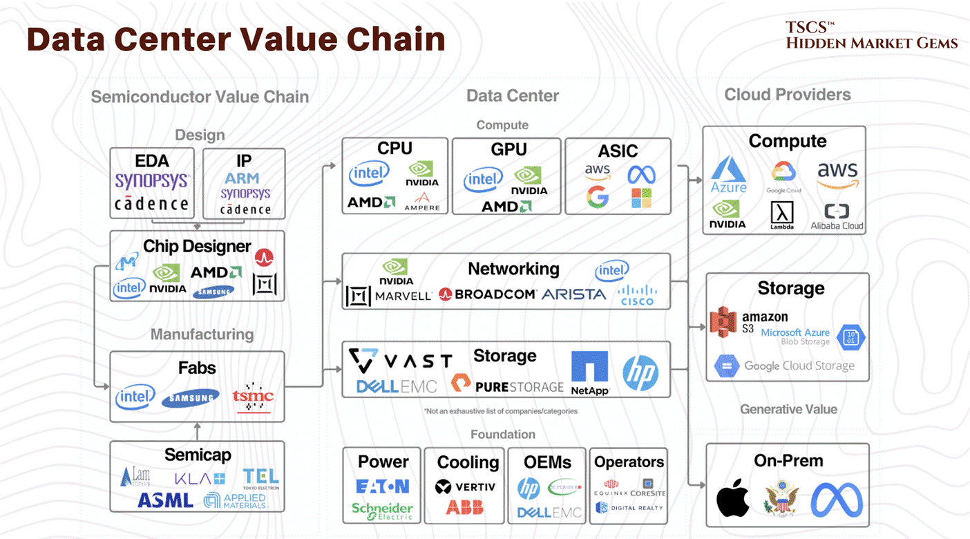 Hyperscalers (Google, Amazon…) both construct their own campuses and lease third‑party capacity (Google through their brand new chips “Tensor Processing Units” or TPU) or Amazon’s Trainium), so their cloud and AI revenue trajectories are the primary indicator of future infrastructure needs. Sustained double‑digit cloud segment growth, especially in AI and data analytics services, typically precedes multi‑year CapEx upcycles as they add power, space, and GPUs.
