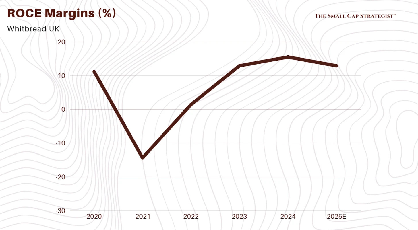 Returns on Capital: Return on Capital Employed (ROCE) is a key metric. UK ROCE was 12.9% in FY25. While down from a post-COVID peak, it remains above the historic average. The core strategy (AGP) is explicitly designed to improve ROCE to a target of 15% by recycling capital from low-return restaurant assets into high-return hotel rooms.