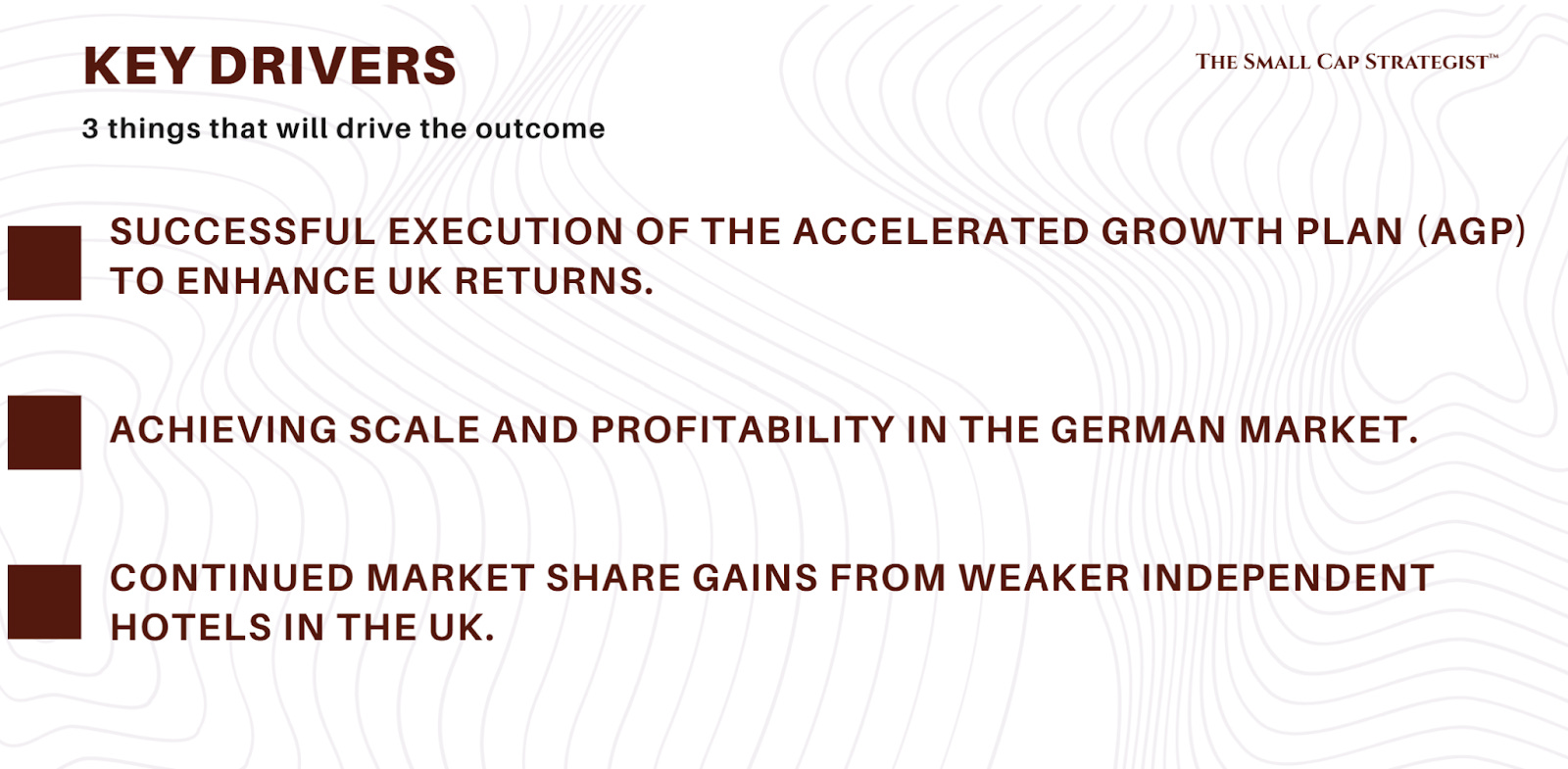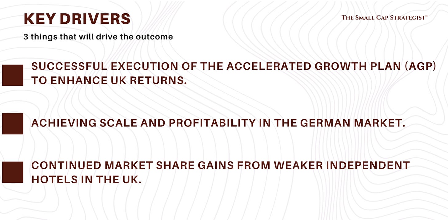 Volume: Robust underlying volumes, with UK occupancy at 81%. Room count is growing organically through the AGP and the German rollout.