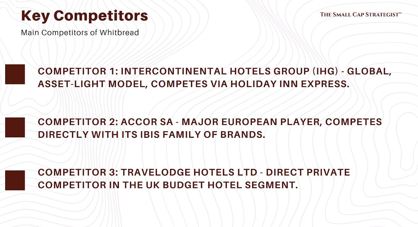 Industry Overview: The budget/midscale hotel sector is cyclical and highly competitive. The industry structure is characterized by a few large, branded chains and a long, fragmented tail of independent operators. A key secular trend is the consolidation of the market as these under-capitalised independents are squeezed out, creating a growth opportunity for scaled players like Whitbread.