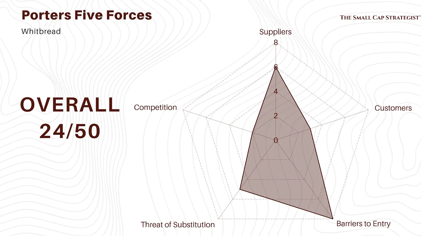 Supplier Power (Score: 6/10): Low to Moderate Power. Key inputs are property, which can be competitive, and labor, which is subject to wage inflation. However, Whitbread’s scale provides significant bargaining power over other suppliers (e.g., food, linens, technology), mitigating cost pressures.