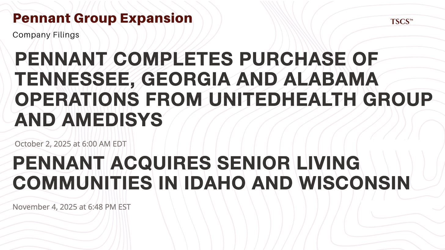 Pennant, in particular, has a fascinating model. They acquire small agencies and spin off local leaders, giving them autonomy, “local ownership”. It’s a decentralized model that scales well and aligns incentives. They recently dropped $146.5 million to acquire operations in Tennessee, Georgia, and Alabama. They are betting big on the Southeast.