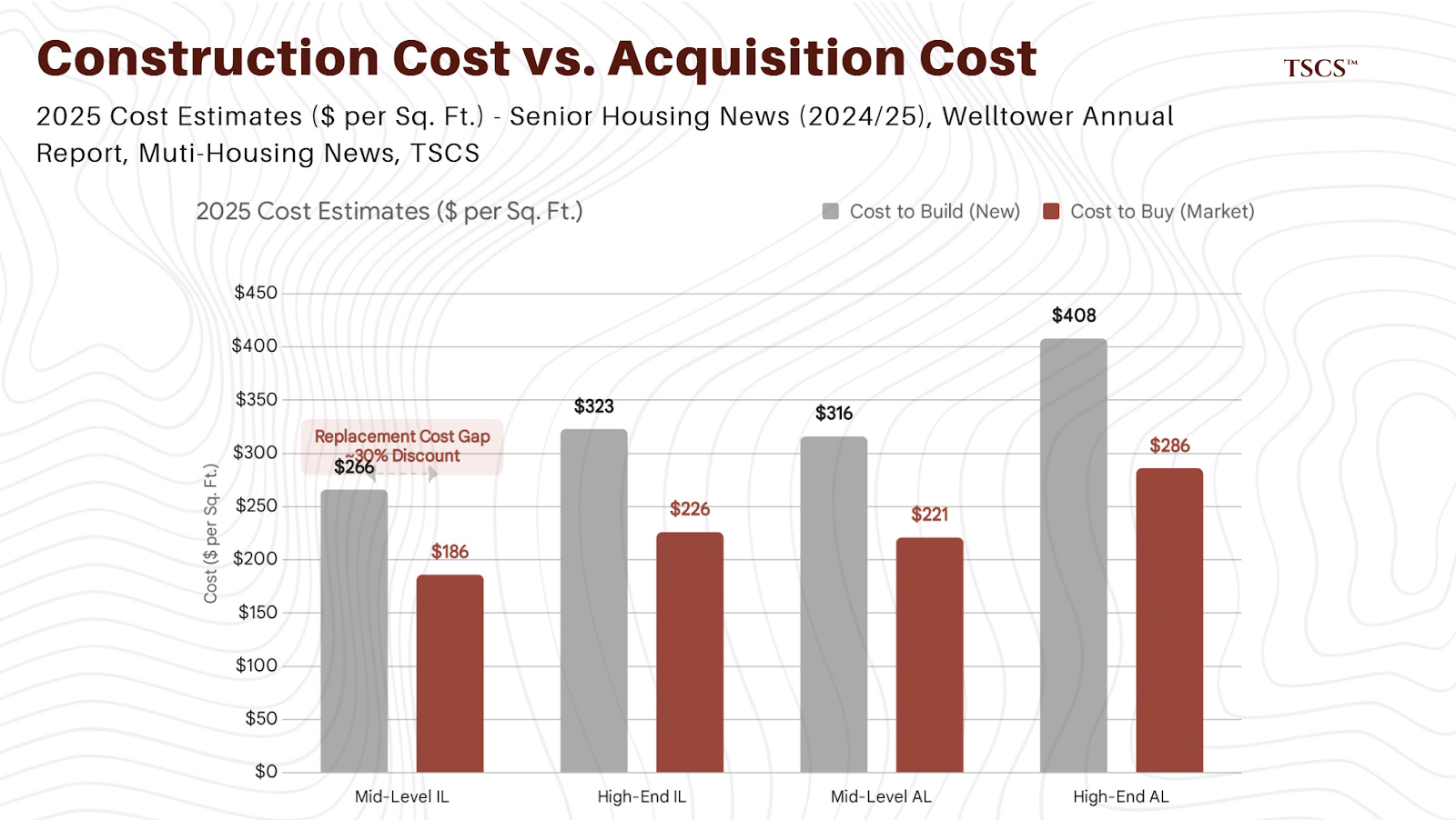 Construction costs haven’t come down. They’ve stabilized at a high plateau. We see mid-level assisted living construction at $274-$349 per square foot. That’s just the building. Add land, soft costs, FF&E (Furniture, Fixtures, and Equipment), and carry costs. You are looking at $350k-$450k per unit to build new.